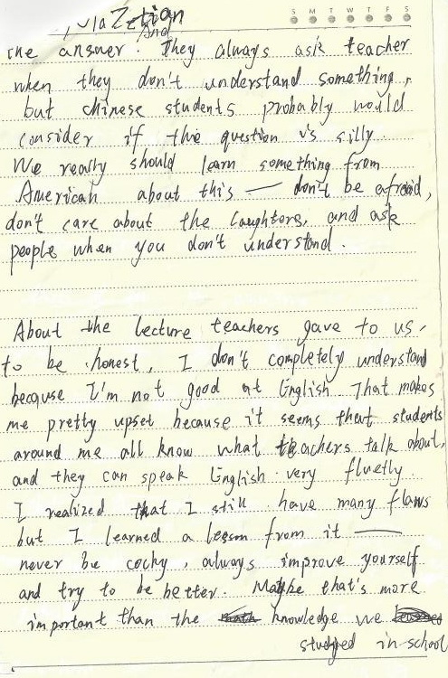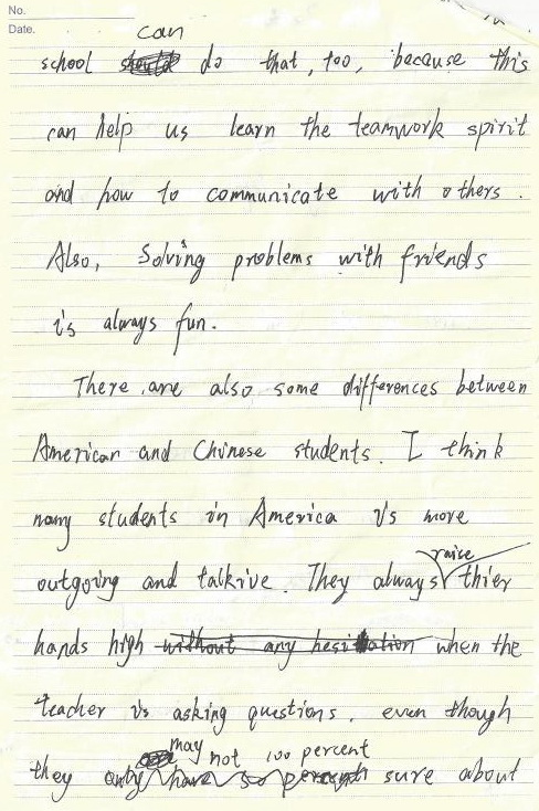 And in some classroom many students can use one large-table together , so students can sit around and discuss questions as a group. I think Chinese school can do that, too, because this can help us learn the teamwork spirit and how to communicate with others. Also, solving problems with friends is always fun. There are also some differences between American and Chinese students. I think many students in America is more outgoing and talkive. They always raise their hands high when the teacher is asking questions, even though they may not 100 percent sure about the answer. They always ask teacher when they don’t understand something, but Chinese students probably would consider if the question is silly. We really should learn something from American about this – don’t be afraid, don’t care about the laughters, and ask people when you don’t understand.