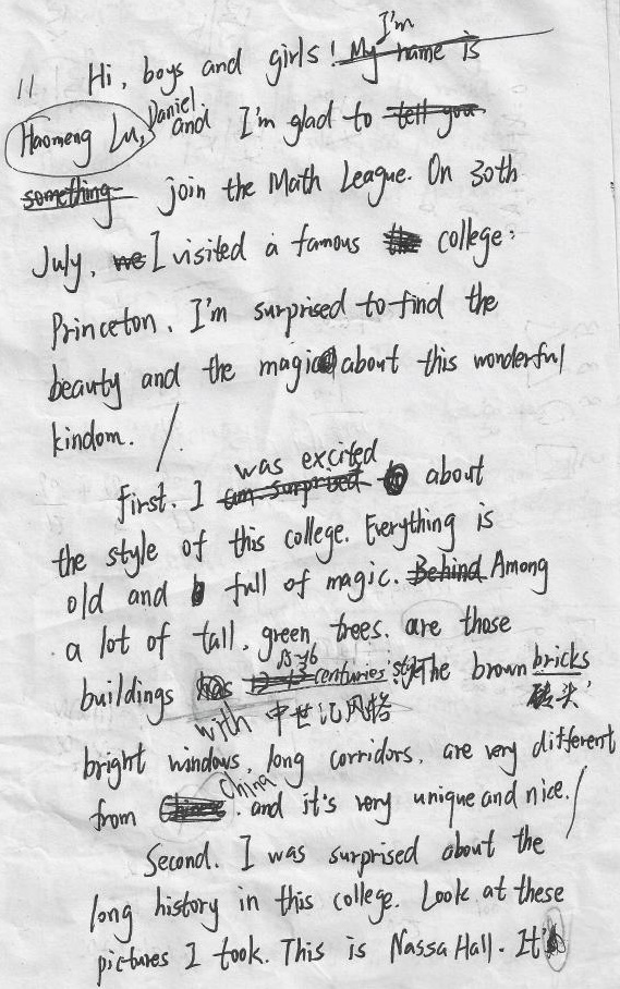 Hi, boys and girls! I’m Haomeng Lu, Daniel and I’m glad to join the Math League. On 30th July. I visited a famous college: Princeton. I’m surprised to find the beauty and the magic about this wonderful kingdom.