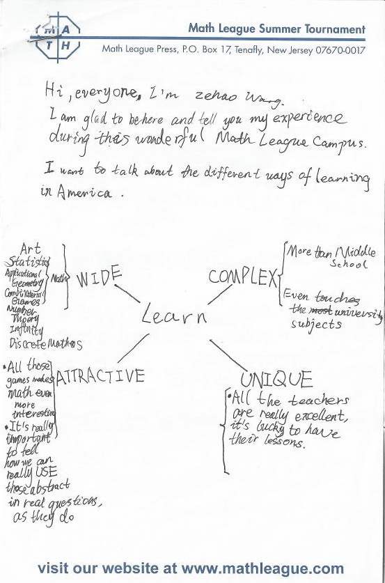 Hi, everyone, I’m Zehao Wang. I am glad to be here and tell you my experience during this wonderful Math League campus. I want to talk about the different ways of learning in America.