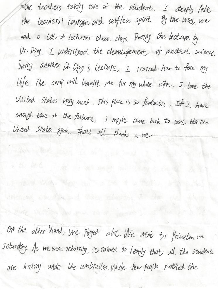 The deepest memory of the camp, is not the wonderful sightseeing of Princeton. Is not the editing text of math. It is the rain when we went back. Teachers and students walked together. Though everyone get wet, but the unforgettable trips forever hid in my heart.