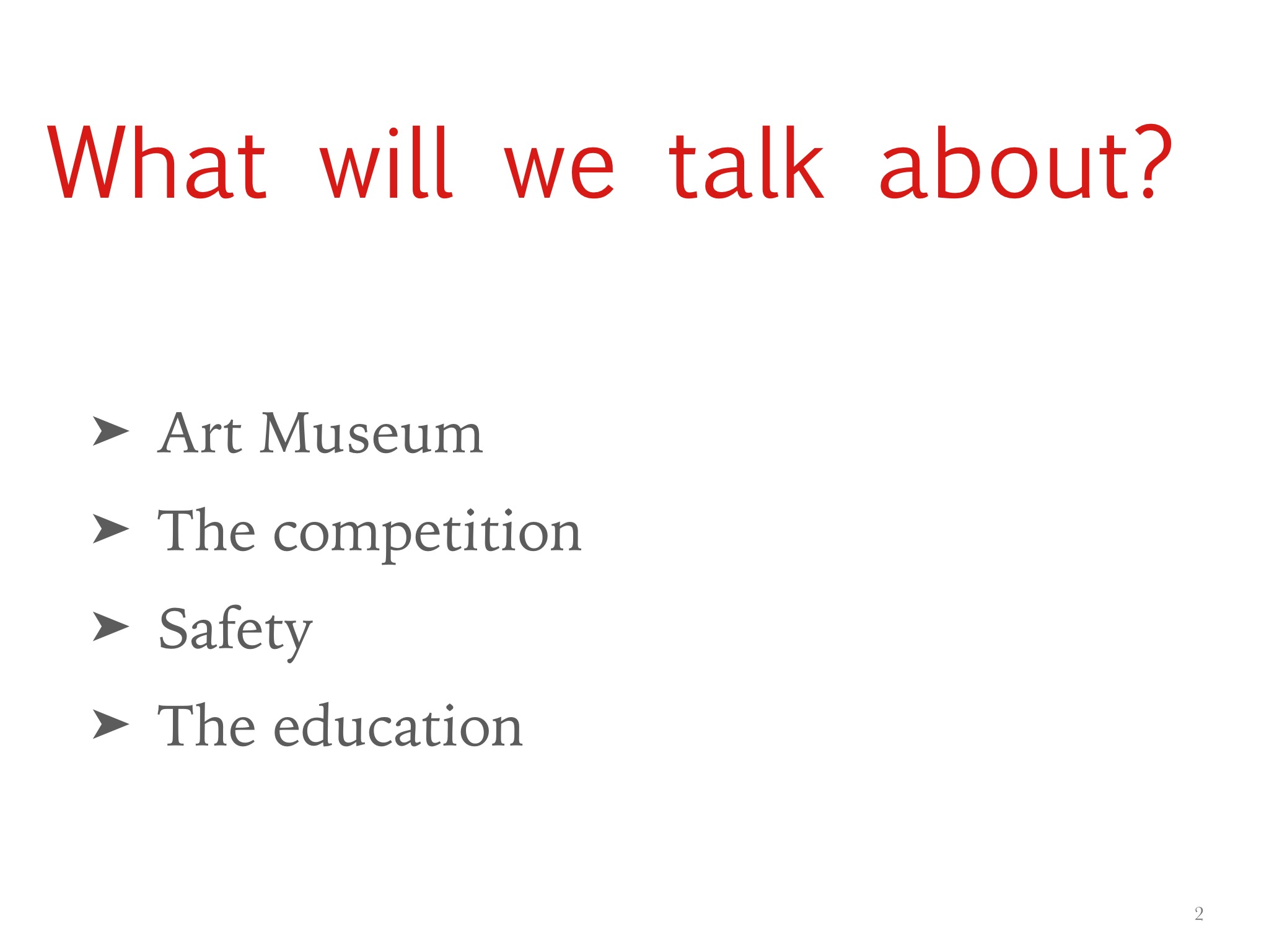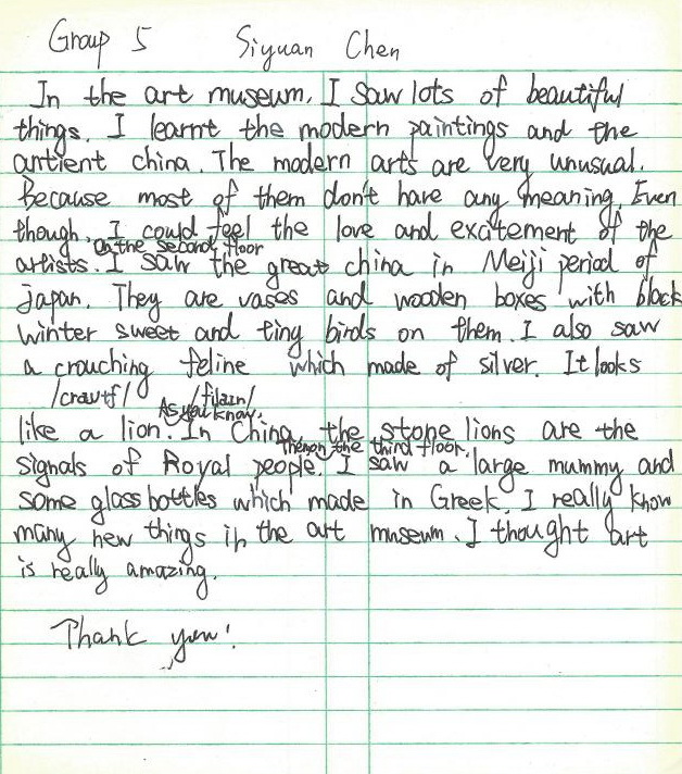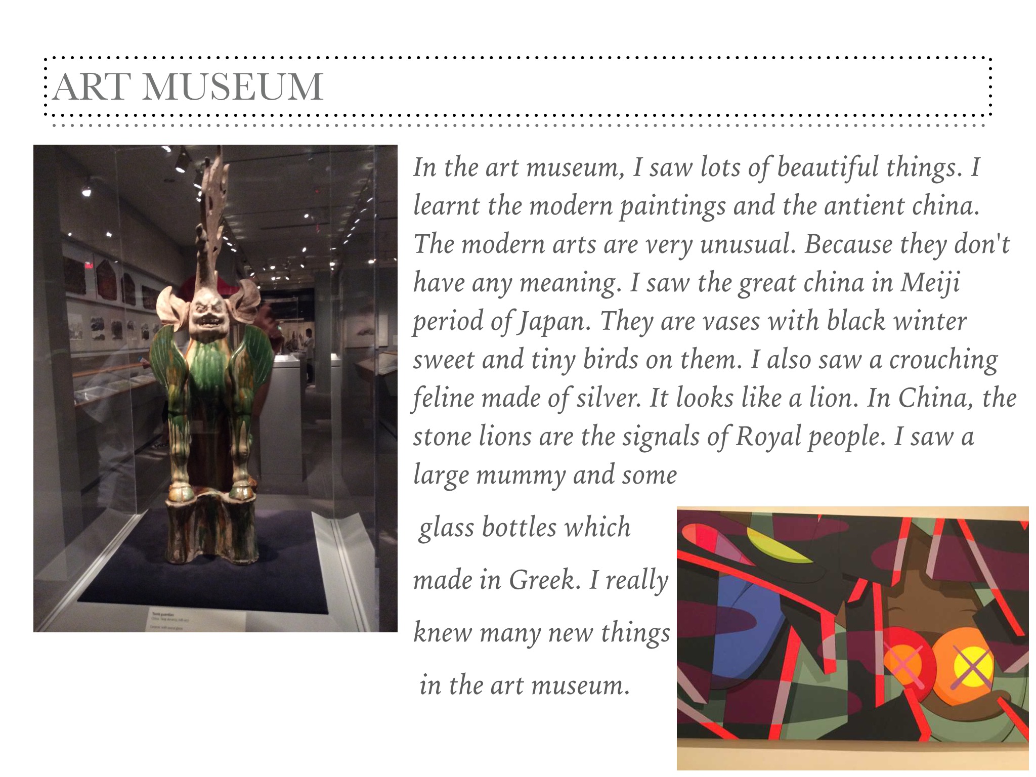In the art museum, I saw lots of beautiful things. I learnt the modern paintings and the ancient china. The modern arts are very unusual. Because most of them don’t have any meaning. Even though, I could feel the love and excitement of the artists. On the second floor I saw the great china in Meiji period of Japan. They are vases and wooden boxes with black winter sweet and tiny birds on them. I also saw a crouching feline which made of silver. It looks like a lion. As you know in China, the stone lions are the signals of Royal people. Then on the third floor, I saw a large mummy and some glass bottles which made in Greek, I really know many new things in the art museum. I thought art is really amazing. Thank you!