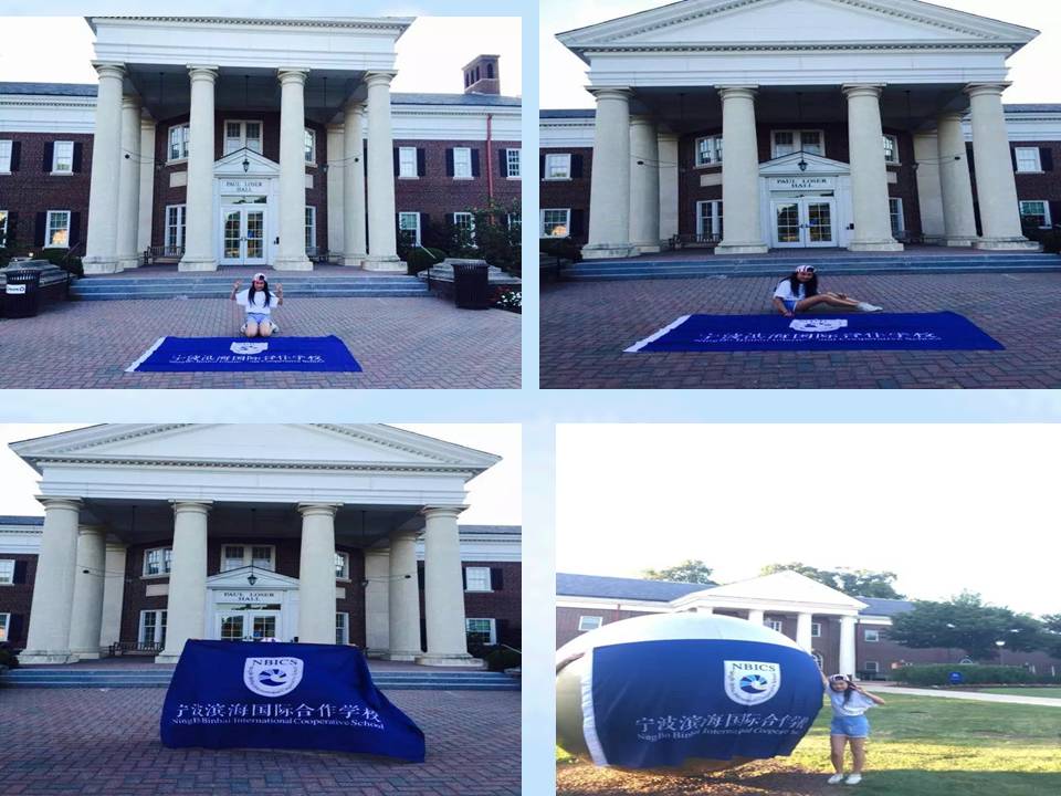 我从家里出发时悄悄地带上了我们滨海的校旗,原本打算在新泽西学院的大门口举着校旗合影留念的,没想到,找了几天我都没有找到正大门,终于有一天找到的时候,下暴雨,没有机会合影。一直到最后一天,只有在教学楼下合影了,留下我的祝福,希望更多的滨海学子能够来到新泽西。