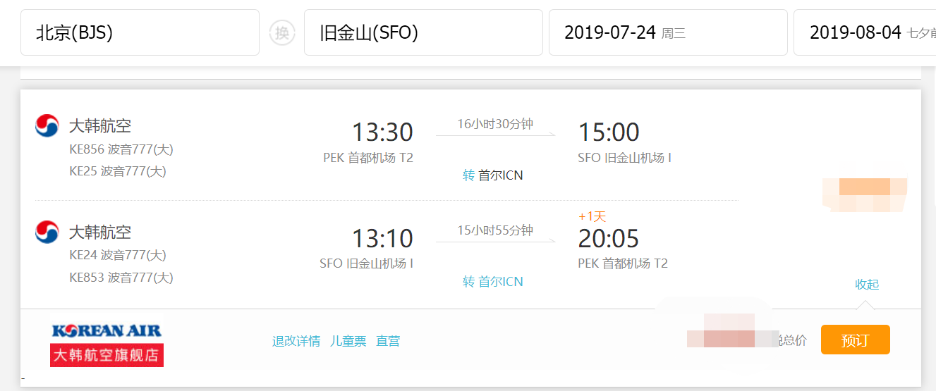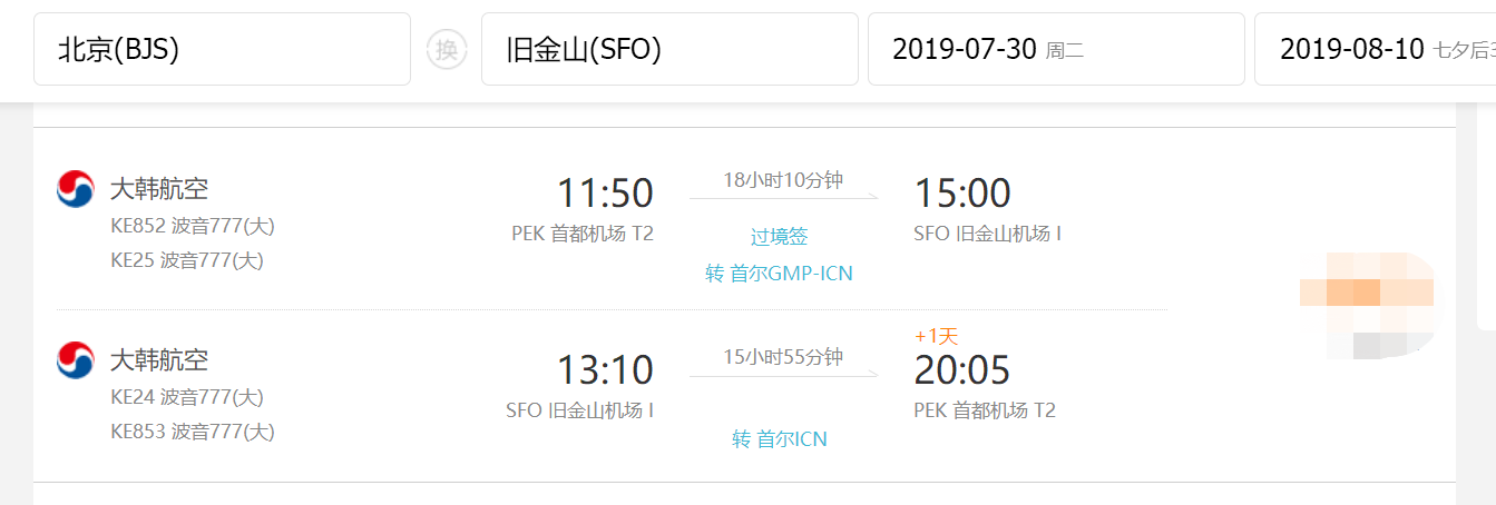 • 直飞航段,航班号CA986, 中国国际航空公司,旧金山国际机场 (14:50) -> 北京首都国际机场(17:55 + 1天)