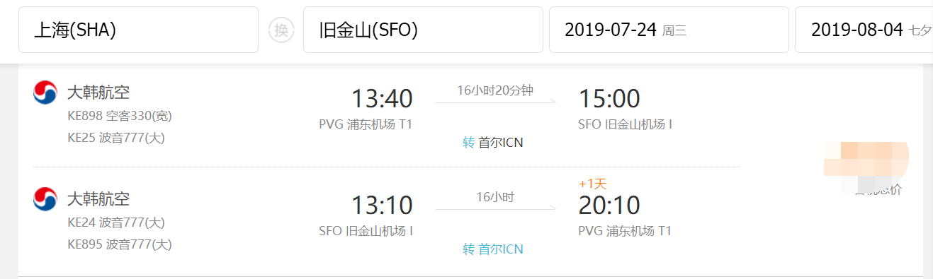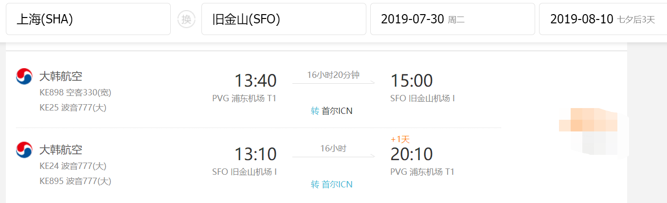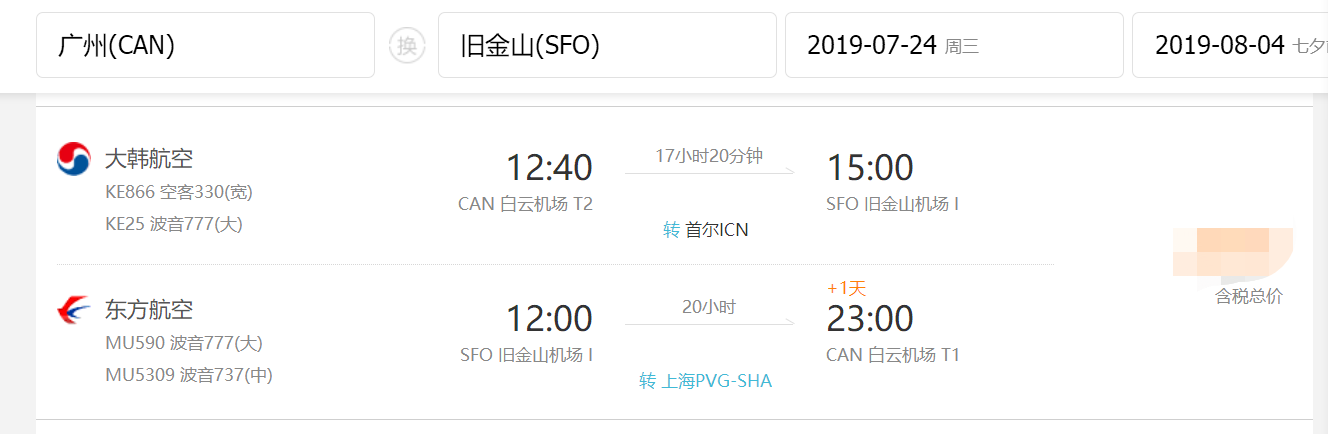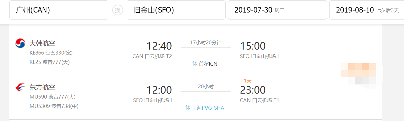 • 直飞航段,航班号MU590, 东方航空,旧金山国际机场 (12:00) -> 上海浦东国际机场 (16:30 + 1天)