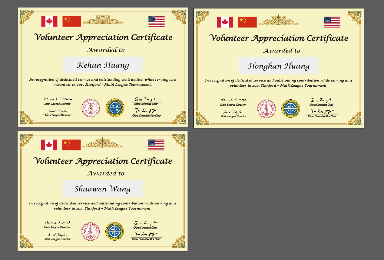 - 美国“大联盟”(Math League)思维探索活动组委会给在研学嘉年华中热心帮助老师和其他同学的学生颁发“志愿者义工证书”。 查看往届“志愿者义工证书”。
