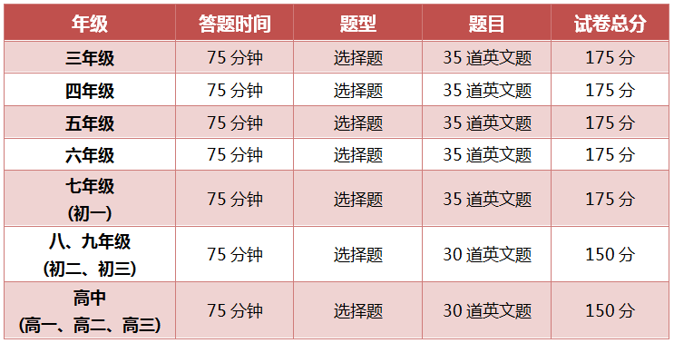 - 三年级的数学试题采用美国“大联盟”(Math League)思维探索活动试题(一级),加上组委会命题的挑战题。 答题时间75分钟。全部采用选择题(共35题),总分175分。所有题目为英文原题。 考试时组委会给每个学生提供在线数学常用词汇表(英汉对照)。禁止使用任何字典、词典、计算器、及任何资料(包括纸质及电子版的)。