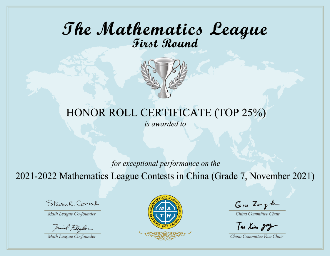 2021-2022年度美国"大联盟"(Math League)思维探索第一阶段活动证书式样
