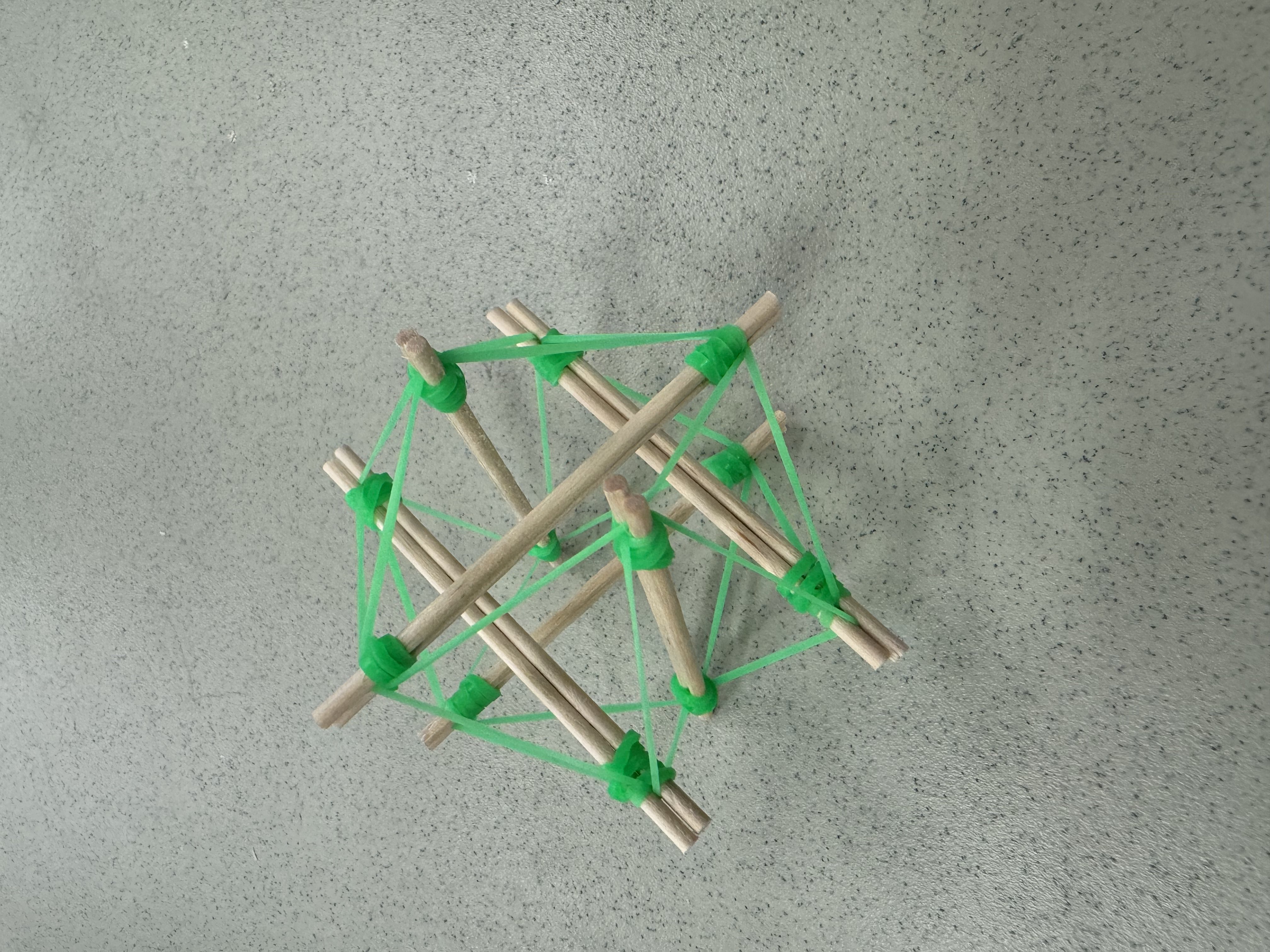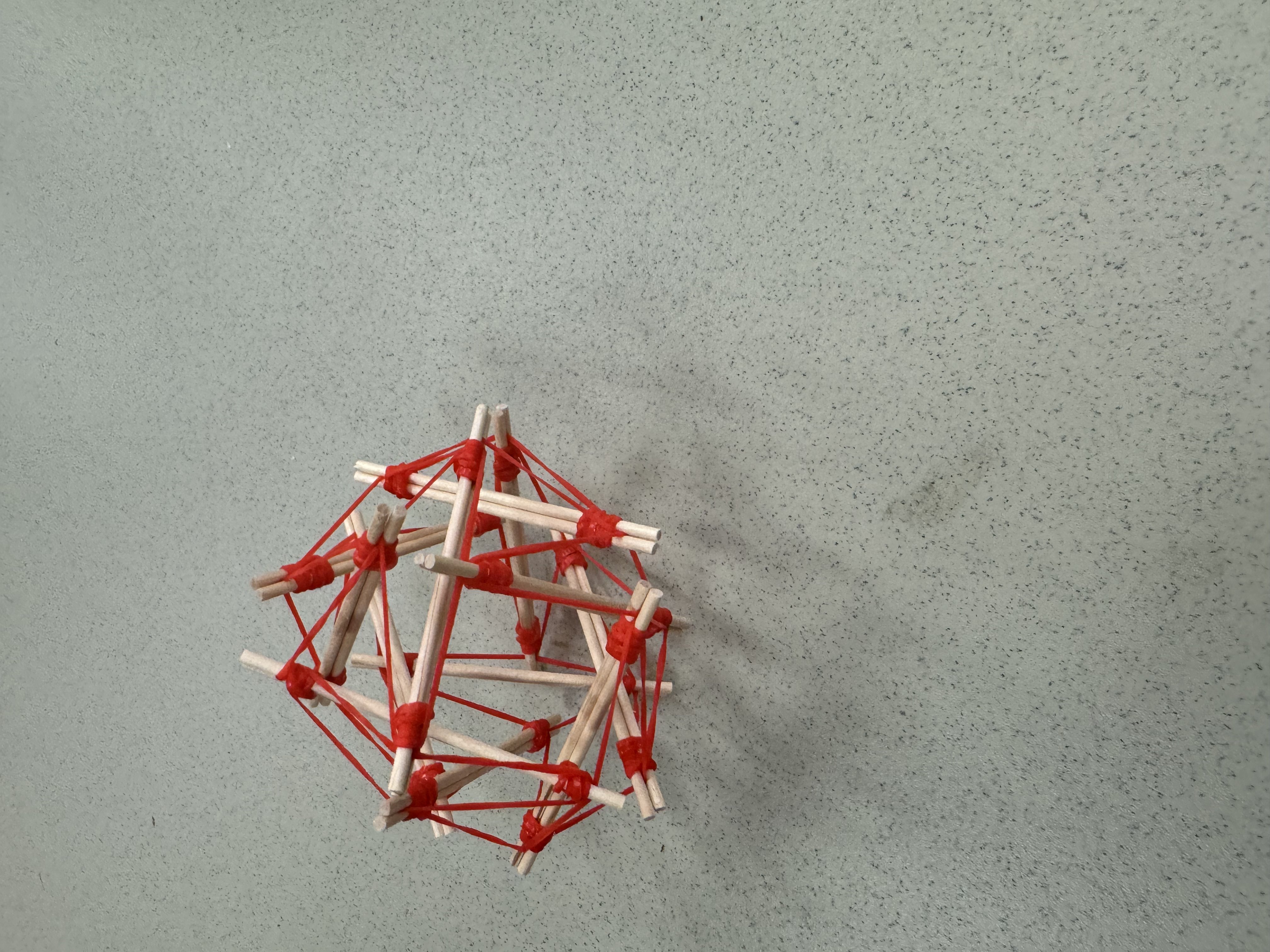 This morning, after breakfast in the cafeteria, students came to the first lecture of the week, featuring presenter Nick Rauh from the Seattle Universal Math Museum on “tensegrity polyhedra.” (“Tensegrity” was apparently coined by the famous architect Buckminster Fuller.) Using small dowels and rubber bands, students were challenged to create “tensegrity units” consisting of two dowels joined at each end by rubber bands, with an additional rubber band running the length of the dowels pinched between the two dowels at each end. These units could be combined to form larger constructions. Nick led the students through one such larger construction. Here is Adam’s attempt at creating the cuboctahedron: